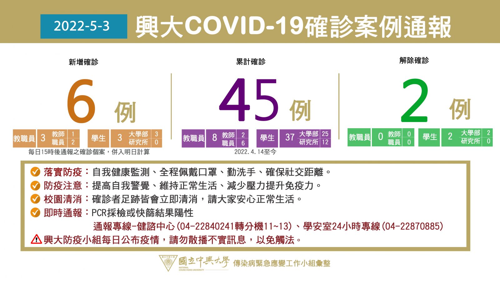 【防疫通報1110503】新增6例、累計45例、解除2例
